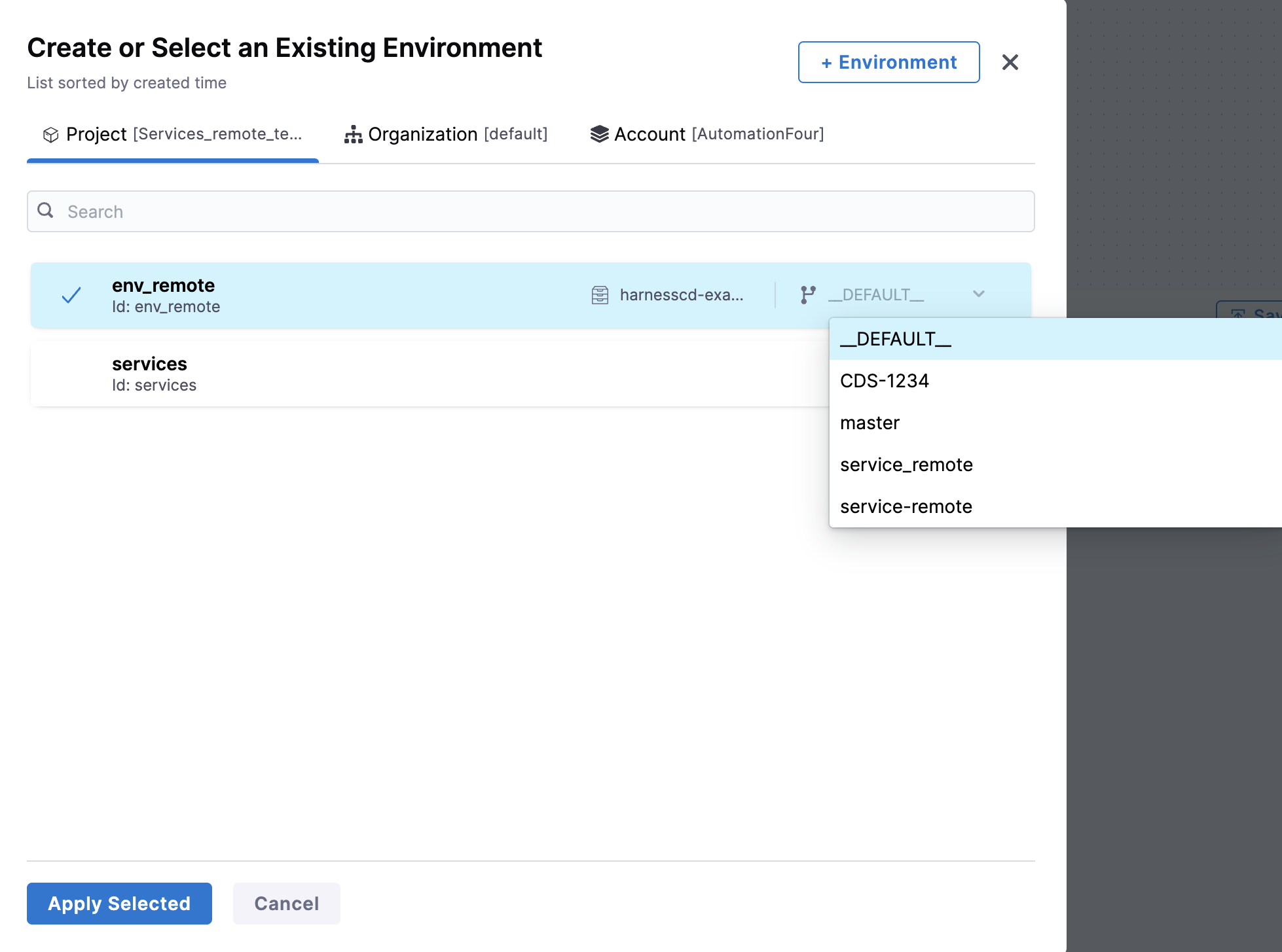 When adding a remote environment to the stage, you have the ability to choose a specific branch to determine the version of the environment you wish to utilize in your pipeline.