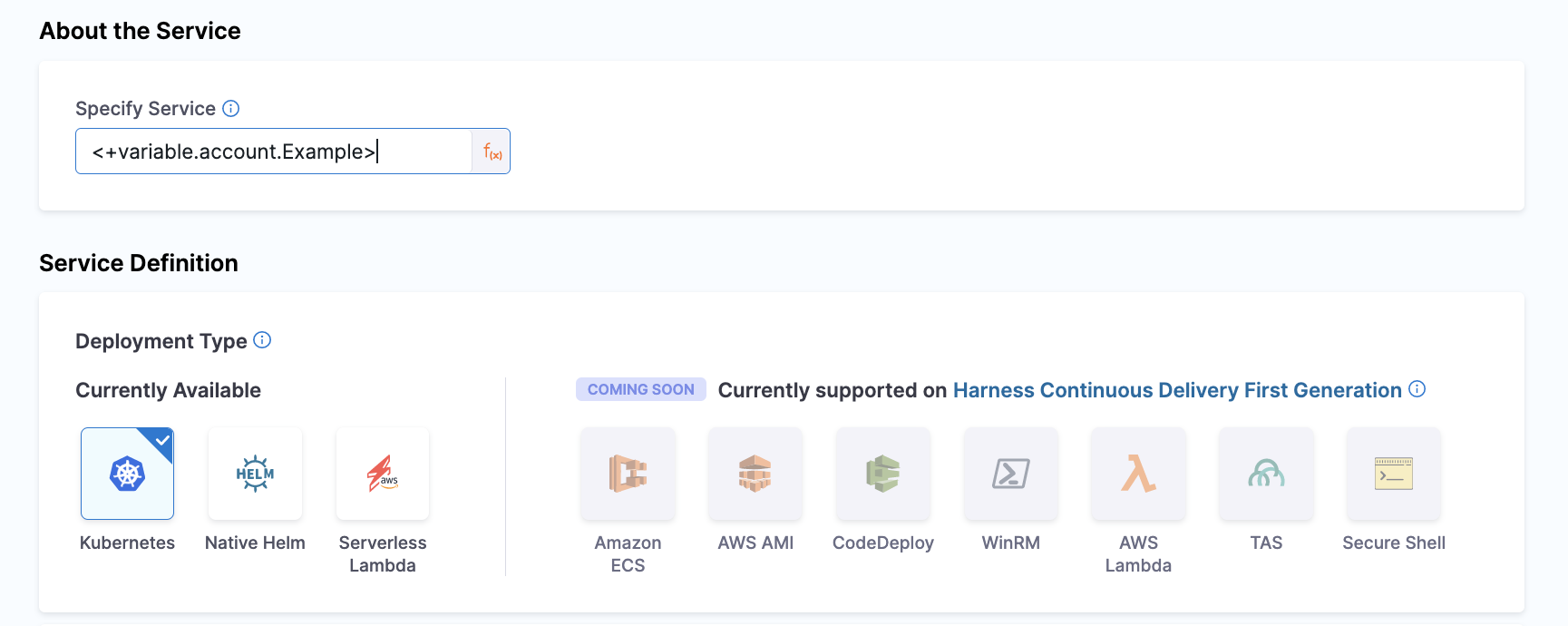 For example, if you have an account variable that stores a service definition, you could use an expression referencing that variable in your CD stage's Specify Service setting.