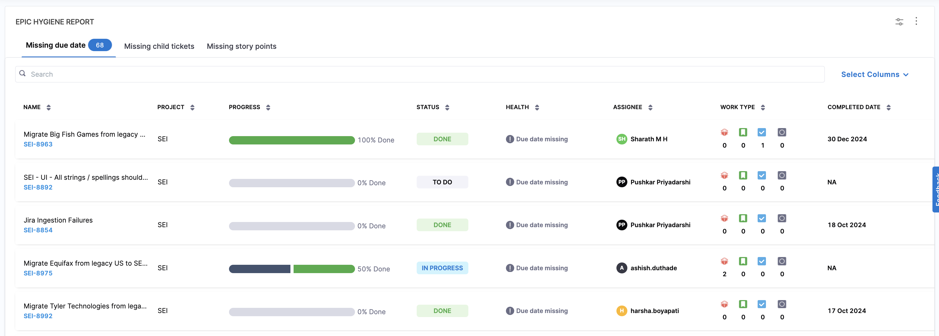 - Missing due dates: Epics that do not have an assigned deadline.